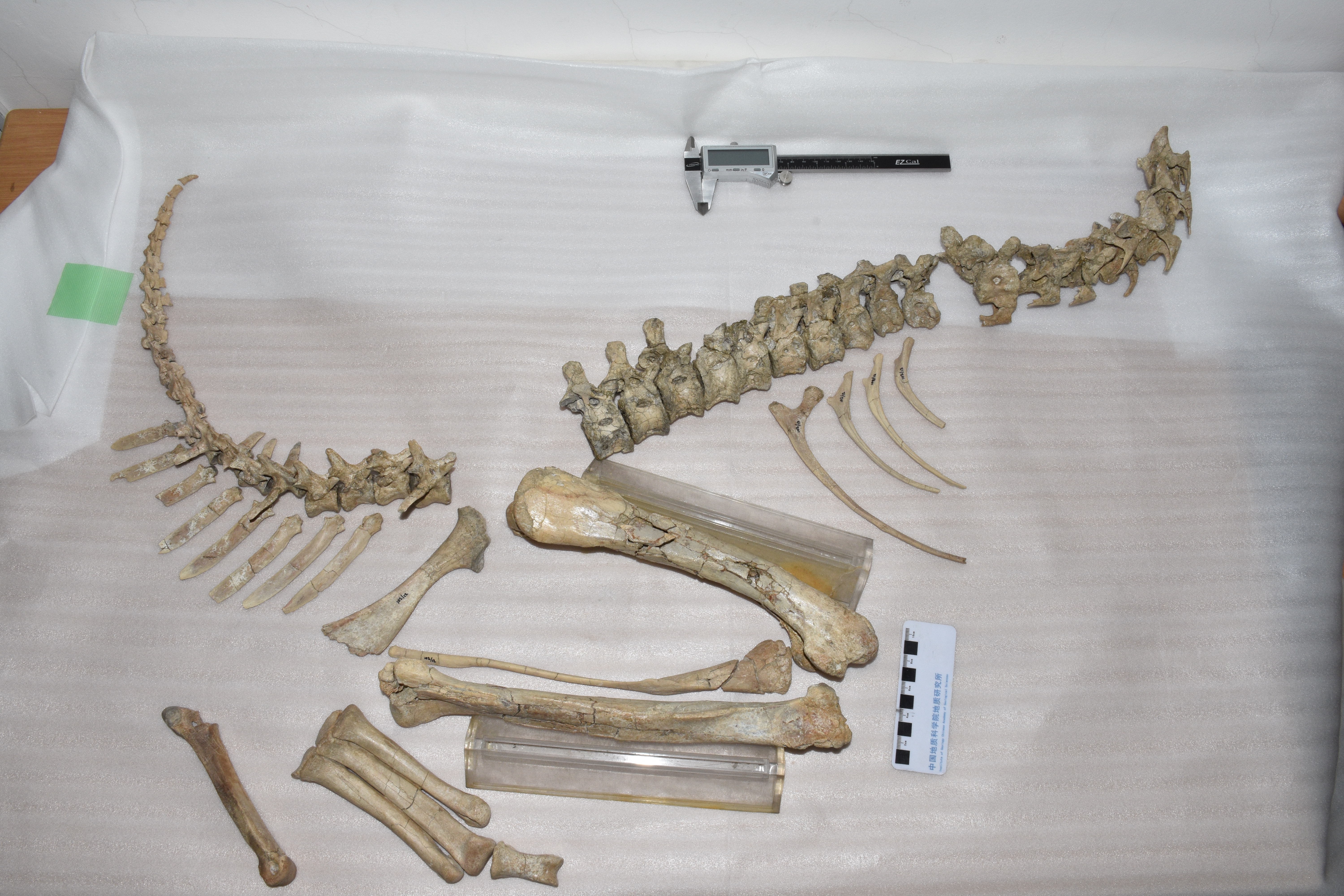 Part of an oviraptorid embryo from Bugiin Tsav. The arm is highlighted. The scale is millimetres.