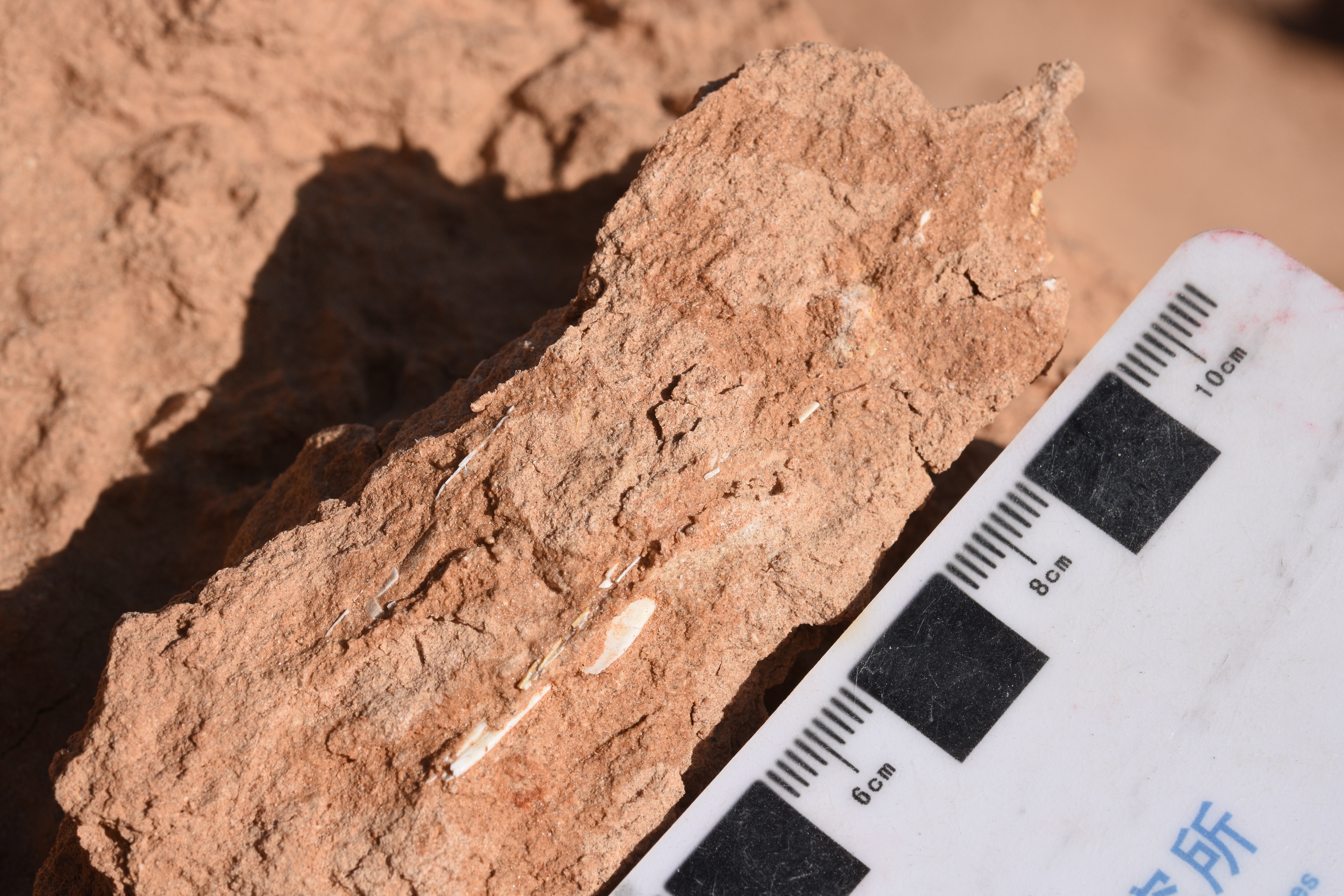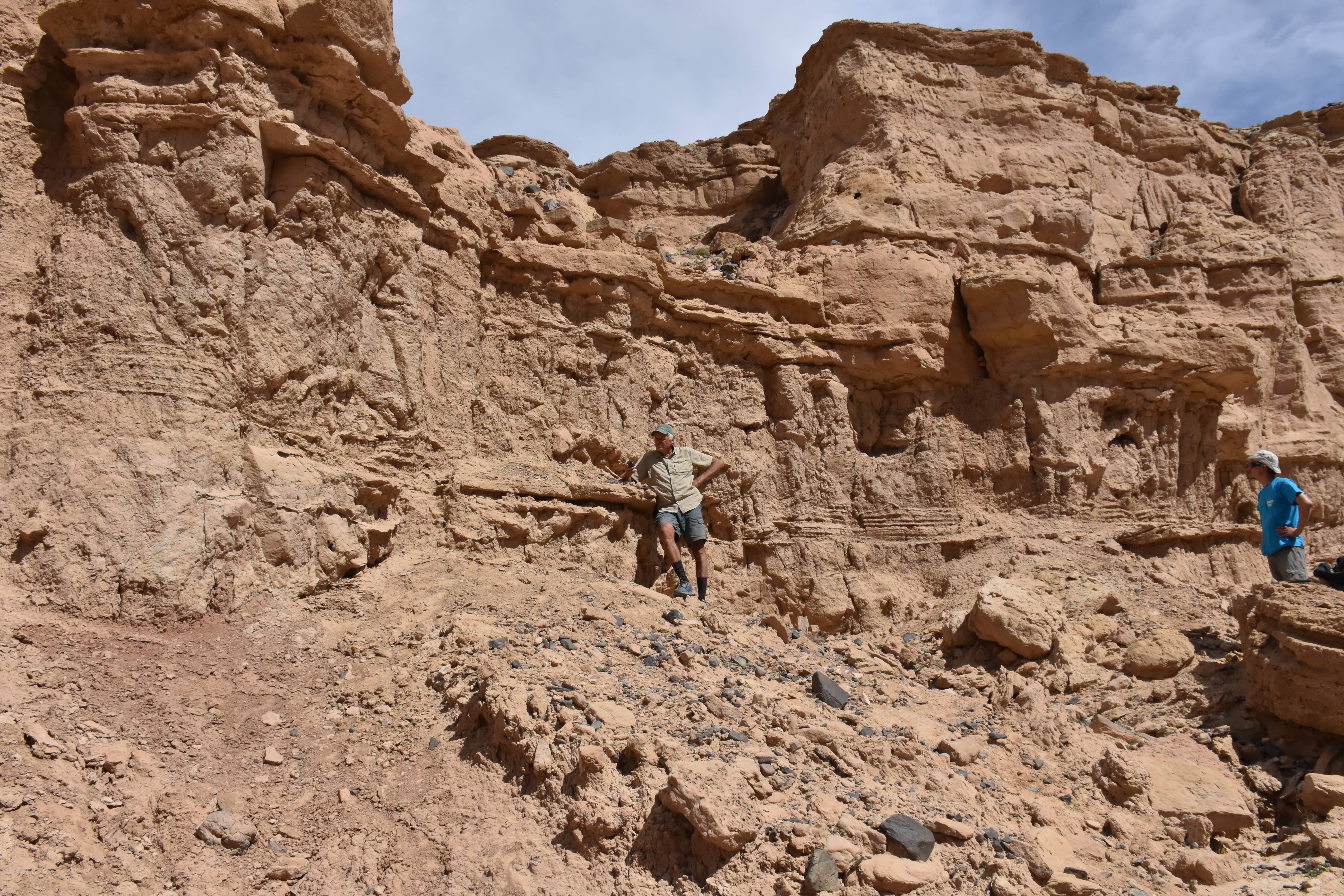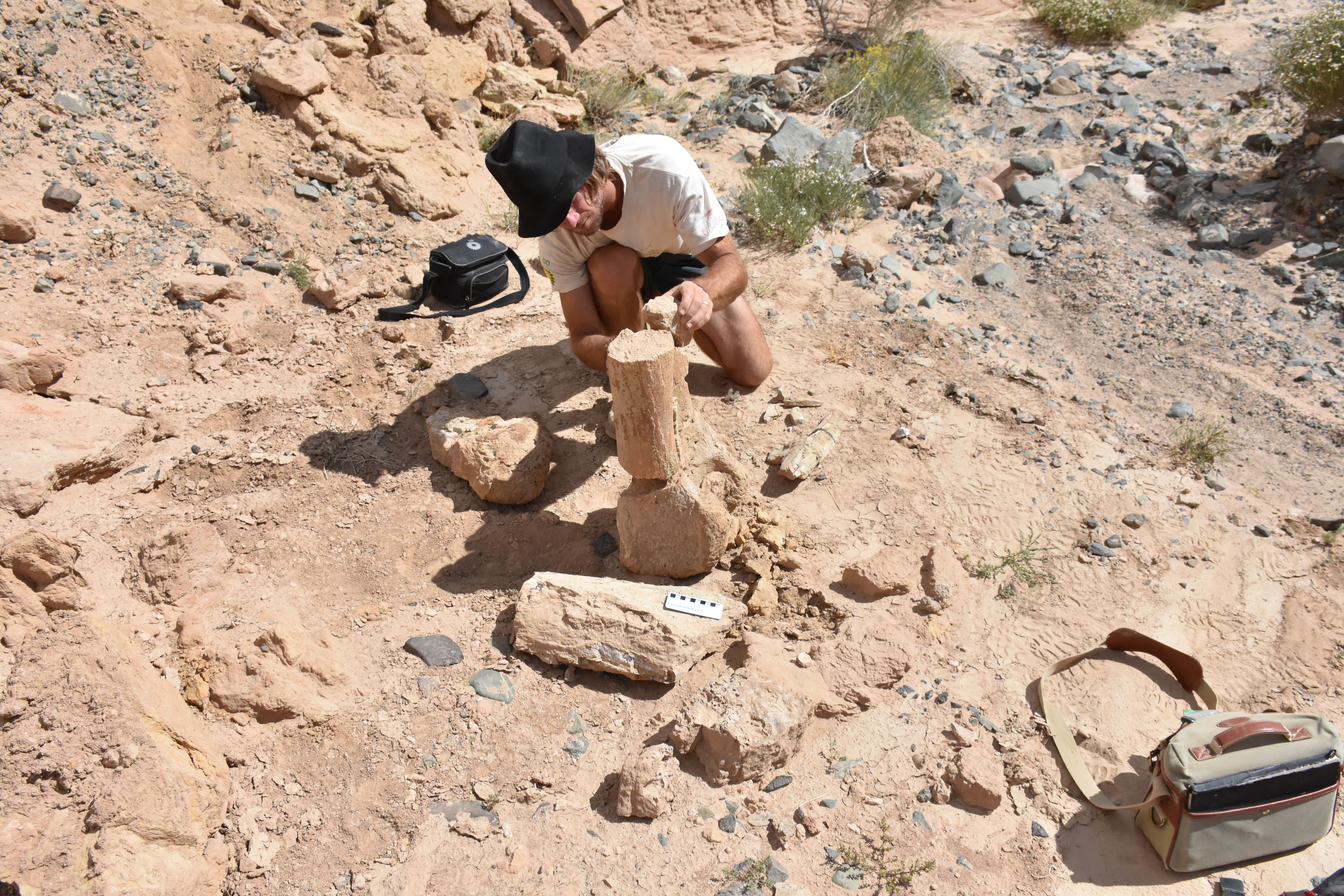 On our first day at Nemegt, we went back to a site where Phil found an oviraptorosaur skull in 2016, but we didn’t find any more material. We prospected for the rest of the morning, but didn’t find too much else. In the afternoon, we went back to the Nemegtosaurus quarry that Federico Fanti rediscovered on the last day in 2016. We wanted to see if there was any more material coming out, as well as get some last bits of data that Phil hadn’t had time to collect last time. This time, we were fairly lucky: Ganzorig found a nice phalanx, and I found a rock with impressions of what may be the skull. The rock had been glued in several places, and alongside it were several pieces of burlap. It seems that this may have been where the skull was trimmed down and jacketed. Establishing that this is indeed the Nemegtosaurus quarry means we can tie the other material to the skull and show that Opisthocoelicaudia is in fact Nemegtosaurus.