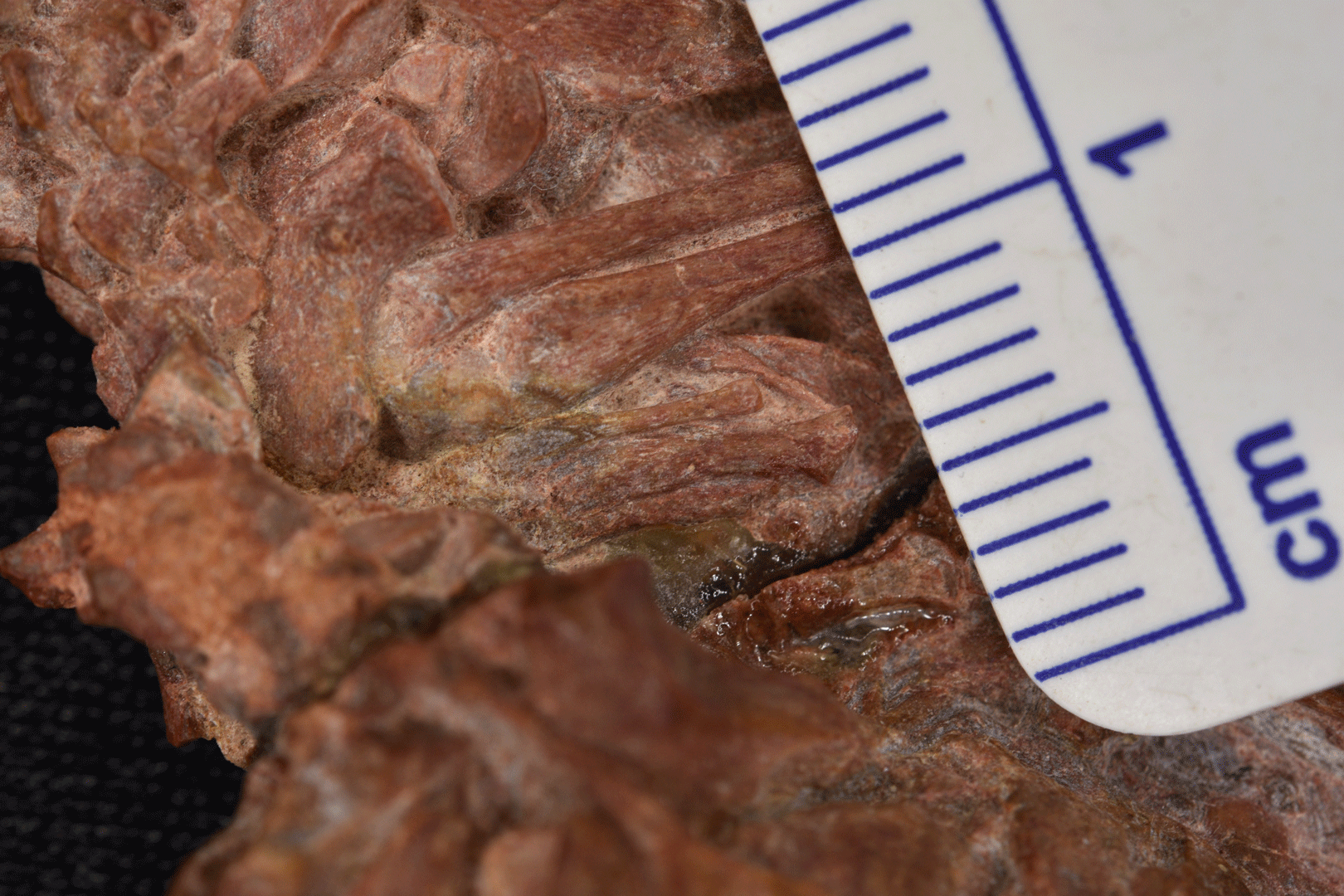 Now that we know more, and armed with a good macro lens, I’ve been able to reinterpret some of the features that puzzled Weishampel et al. First, there’s a lot more of the skeletons than they first interpreted. The best (and smallest) embryo has parts of the skull and a virtually complete skeleton except for the tail. The bones are fairly well ossified too, and some of them have begun to look like adult bones. Two other embryos represent most of a skull and the area around the pelvis, respectively. The skull consists of everything behind the eye and a couple bones from in front as well, which weren’t previously recognized (specifically the nasal). The pelvis is beautifully preserved and has a nearly complete hindlimb as well, missing the foot.