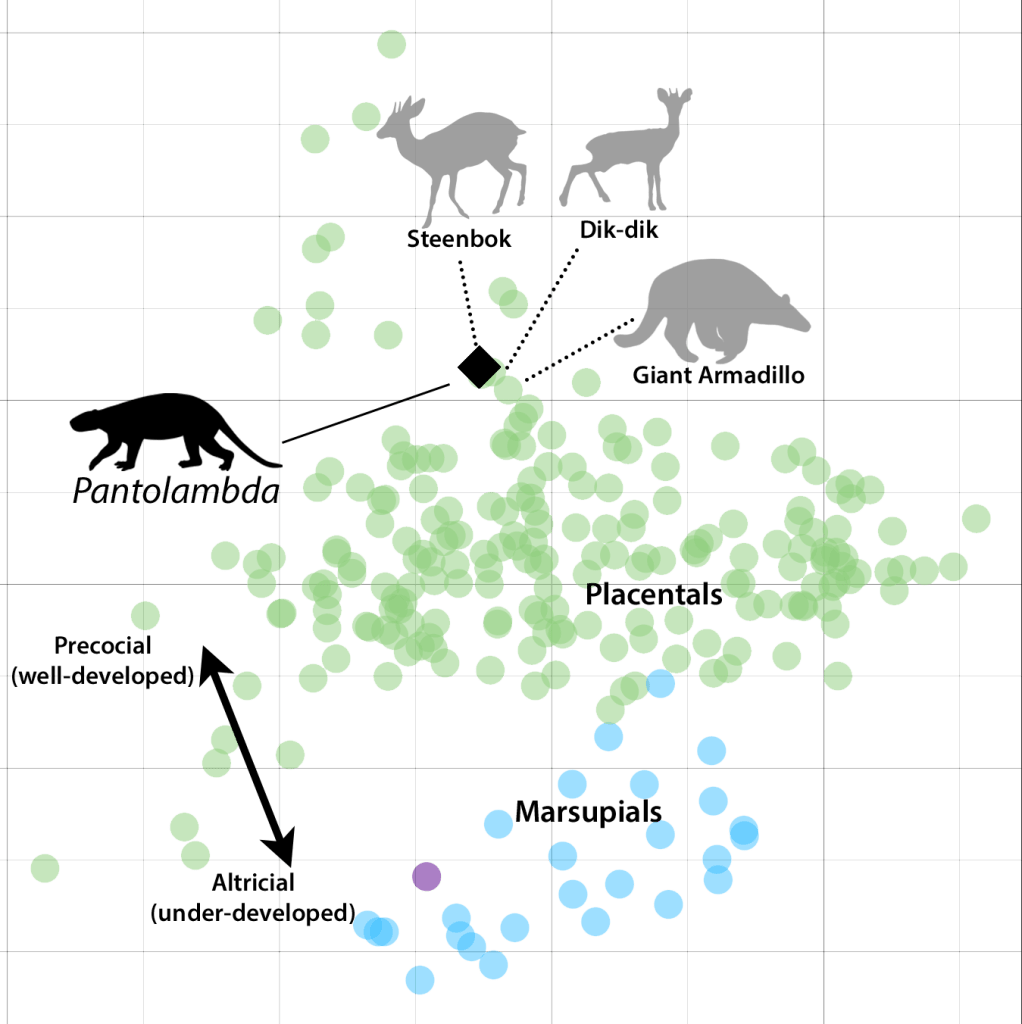 For Pantolambda, one of the largest mammals of its time, this technique shows that its lifestyle was remarkably similar to large hoofed mammals of today. Our data show that it carried its young for 7 months, and the baby—likely just one born in each litter—probably had fur and open eyes. It was born well-developed, with a full complement of teeth, and needed only 75 days of nursing before it was completely independent. This is the first record of a precocial lifestyle in a mammal, a way of living, much like in horses, deer, and sheep, where the young are born ready to go. This lifestyle relies on the specialized tissues that give us and our allied mammals our names: placental mammals.