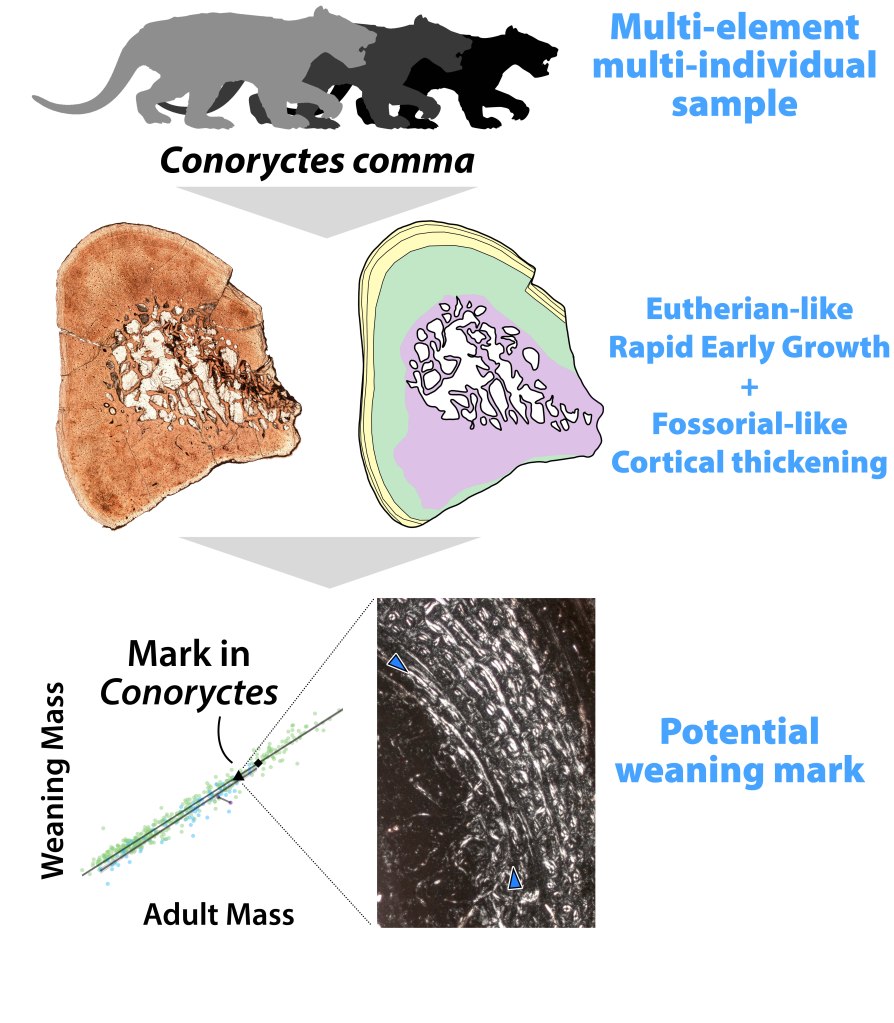 With that context, what we found in Conoryctes is quite interesting. We made thin-sections of the limb bones to look at the rate they grew, as well as yearly growth marks that tell us the age of the individuals (like tree rings). In Conoryctes, these signals looked just like what we see in placental mammals — that means our placental common ancestor (our ‘great-great-grandmother’) probably inherited fast growth from its ancestors. The positions of the yearly growth marks tell us that Conoryctes grew close to adult size (~14 kg) in its first year, similar to many similar-sized placental mammals today. The bones also give us another interesting clue about Conoryctes’ life: a sort of smeared growth mark that probably reflects the struggle of weaning in early life (we found a similar mark in Pantolambda). These results are so far the strongest evidence that the distinctive life history of placental mammals evolved before the Cretaceous extinction, and so might have factored in their meteoric rise afterwards (although they weren’t alone in this attribute).